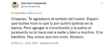 Pero le hizo un recomendación: “Espero que luches todo lo que (y por quién) quieras en la banca. Pero agregar la constitución y la patria al juramento no le hace mal a nadie y bien a muchos. O la bandera. Hay cosas que nos unen. Abrazos”.