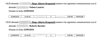 El 22 de septiembre de 2010 fue un día intenso a juzgar por los registros telefónicos. Entre las 16 y las 19 horas, Baratta y Lazarte se comunicaron al menos cinco veces. El Subsecretario de Coordinación y Control de Gestión también recibió 14 llamadas desde una línea a nombre del Ministerio de Planificación.