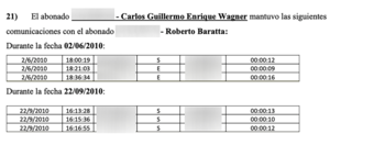 En el caso de Wagner, el entrecruzamiento revela que habló con Baratta y sus laderos en las fechas de los pagos. El 2 de junio de 2010, según consta en el expediente, los valijeros del Ministerio de Planificación retiraron USD 500 mil de la sede de la empresa ESUCO, en San José 151. Ese día, Wagner registra tres llamadas con una línea a nombre de Baratta: a las 18:00, 18:21 y 18:36.