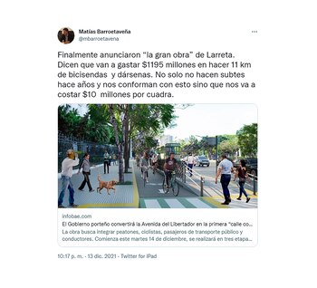 Matías Barroetaveña, legislador porteño del Frente de Todos, cuestionó al gobierno de Larreta por darle prioridad a este tipo de proyectos antes que avanzar con la ampliación de la red del subterráneo, un reclamo en el que suele insistir la oposición. “Mientras Santiago de Chile se propone sumar decenas de km de subte, como han hecho San Pablo y las grandes capitales europeas, en la Ciudad anuncian cómo una gran obra una bicisenda por Avenida Libertador”, dijo a Infobae el director del Centro de Estudios Metropolitanos de la UMET.