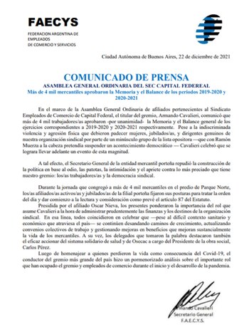 Tras los incidentes, desde el oficialismo de Comercio difundieron un comunicado sobre lo ocurrido. “En el marco de la Asamblea General Ordinaria de afiliados pertenecientes al Sindicato Empleados de Comercio de Capital Federal, el titular del gremio, Armando Cavalieri, comunicó que más de 4 mil trabajadores/as aprobaron -por unanimidad- la Memoria y el Balance general de los ejercicios correspondientes a 2019-2020 y 2020-2021, respectivamente”, dice el texto.