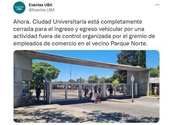 La movilización del gremio también afectó el funcionamiento de la Ciudad Universitaria. Autoridades de la UBA comunicaron a través de las redes sociales que el predio quedó cerrado para el ingreso y el egreso vehicular “por una actividad fuera de control organizada por el gremio de empleados de comercio”.