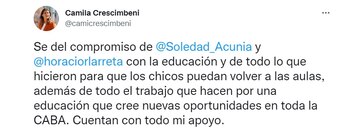 La diputada Camila Crescimbeni destacó “el compromiso de Acuña y Rodríguez Larreta con la educación” y elogió sus esfuerzos “para que los chicos puedan volver a las aulas”.