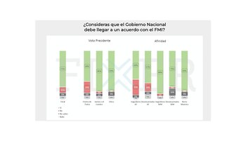 En tanto, del estudio se desprende que el 75% de los argentinos estaba de acuerdo con que el gobierno llegara a un acuerdo con el FMI. El dato más saliente es que entre los votantes del Frente de Todos, el 64% dijo estar a favor. El estudio se realizó días antes de que se firmara el principio de acuerdo con el organismo, y una semana antes de que Máximo Kirchner dejara la presidencia del bloque oficialista, en forma de protesta con la decisión.