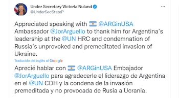 “Hablé con Jorge Arguello (embajador argentino en Estados Unidos) y le agradecí la condena a la invasión premeditada y no provocada de Rusia a Ucrania”, expresó la subsecretaria de Estado estadounidense, Victoria Nuland, a través de las redes sociales. Ambos funcionarios participaron de ´foro de las Naciones Unidas que se realiza en Ginebra, Suiza.