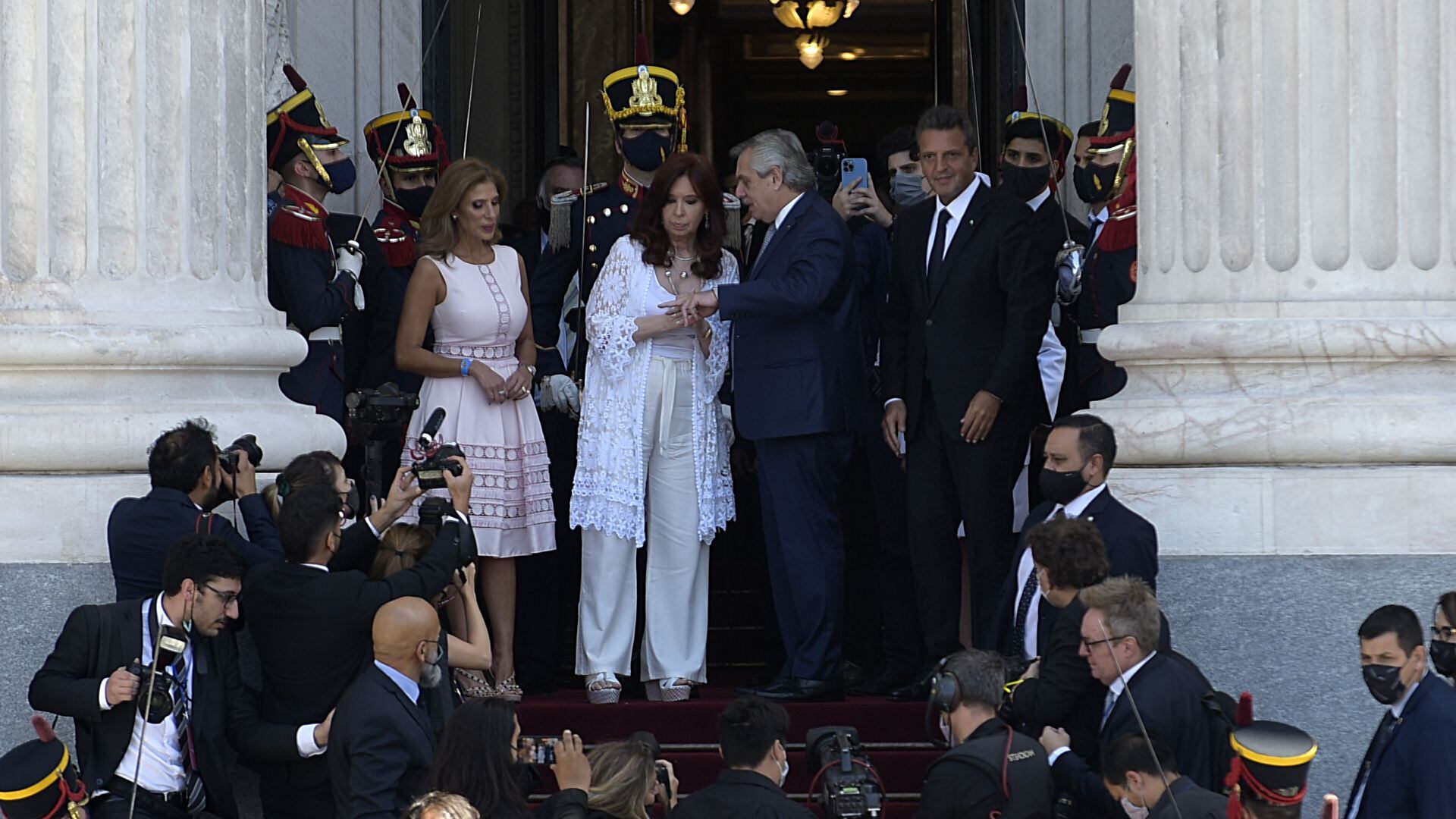 11.49. El presidente Alberto Fernández ingresó al Parlamento en medio de un fuerte operativo de seguridad. Lo recibieron Sergio Massa y Cristina Kirchner, con quién hace meses no comparte un evento público.