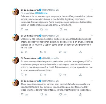 Desde que se conoció el hecho, Gómez Alcorta busca desterrar la idea que se trata de hechos aislados y reemplazarla por el concepto de que “es la forma de ser varones, que se aprende desde niñxs y que define quiénes somos y cómo nos vinculamos, la que habilita, legitima y reproduce violencias”, y señala que, “durante siglos, esa fue la manera en que habitamos la identidad, sobre un pacto implícito que nos define y condiciona”.
