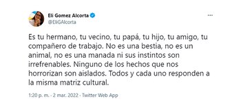”Es tu hermano, tu vecino, tu papá, tu hijo, tu amigo, tu compañero de trabajo. No es una bestia, no es un animal, no es una manada ni sus instintos son irrefrenables. Ninguno de los hechos que nos horrorizan son aislados. Todos y cada uno responden a la misma matriz cultural”, aseguró la ministra en una serie de tiuts publicados en su cuenta personal.