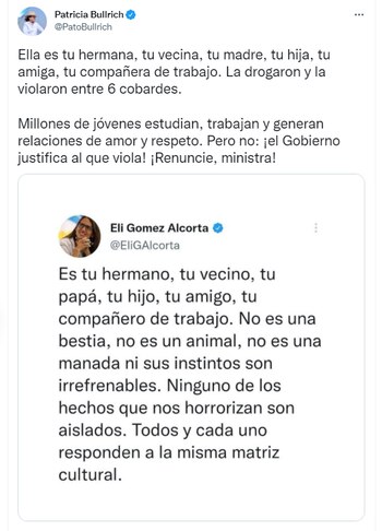 “Ella es tu hermana, tu vecina, tu madre, tu hija, tu amiga, tu compañera de trabajo. La drogaron y la violaron entre 6 cobardes. Millones de jóvenes estudian, trabajan y generan relaciones de amor y respeto. Pero no: ¡el Gobierno justifica al que viola! ¡Renuncie, ministra!”, fue la respuesta contundente que difundió, también por Twitter, Patricia Bullrich.