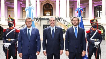 El presidente Alberto Fernández recibió este mediodía a su par de República Dominicana, Luis Abinader Corona, con quien compartió un almuerzo de trabajo y encabezó la firma de una declaración conjunta para promover el desarrollo hidrocarburífero entre ambos países, entre otros acuerdos productivos y de cooperación sanitaria. Acompañado por la primera dama, Fabiola Yáñez, el mandatario argentino recibió a los visitantes a las 13.13 en el Salón de los Bustos de la Casa Rosada, mientras sonaba la fanfarria del Regimiento de Granaderos a Caballo, está vez ubicado a resguardo en la galería que rodea al Patio de las Palmeras por la intensa llovizna.
