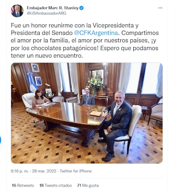 Por su parte, el funcionario norteamericano publicó en sus redes sociales la misma foto en el Senado y detalló el contenido del encuentro: “Fue un honor reunirme con la Vicepresidenta y Presidenta del Senado, Cristina Kirchner. Compartimos el amor por la familia, el amor por nuestros países, ¡y por los chocolates patagónicos! Espero que podamos tener un nuevo encuentro”.