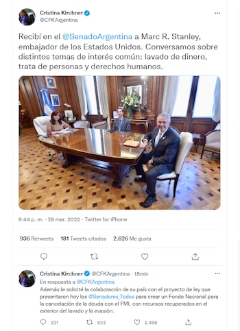 “Recibí en el Senado a Marc R. Stanley, embajador de los Estados Unidos. Conversamos sobre distintos temas de interés común: lavado de dinero, trata de personas y derechos humanos”, explicó la vicepresidenta en su mensaje publicado en su cuenta personal de esa red social.