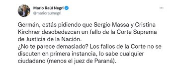 Sin embargo, la respuesta de la oposición no se hizo esperar. El jefe del bloque UCR, Mario Negri, interpretó que una demora en la designación de los dos representantes significaría que Sergio Massa y Cristina Kirchner “desobedezcan un fallo de la Corte Suprema”.