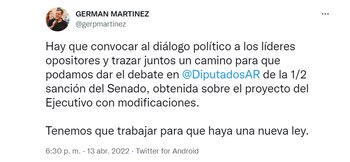 El jefe de la bancada del Frente de Todos, Germán Martínez, llamó a través de las redes sociales a aprovechar esta “ventana de oportunidad para encausar institucionalmente el tema”. En esa línea, convocó a los líderes de la oposición para poder avanzar con el debate parlamentario en la Cámara de Diputados del proyecto que ya tiene media sanción del Senado.