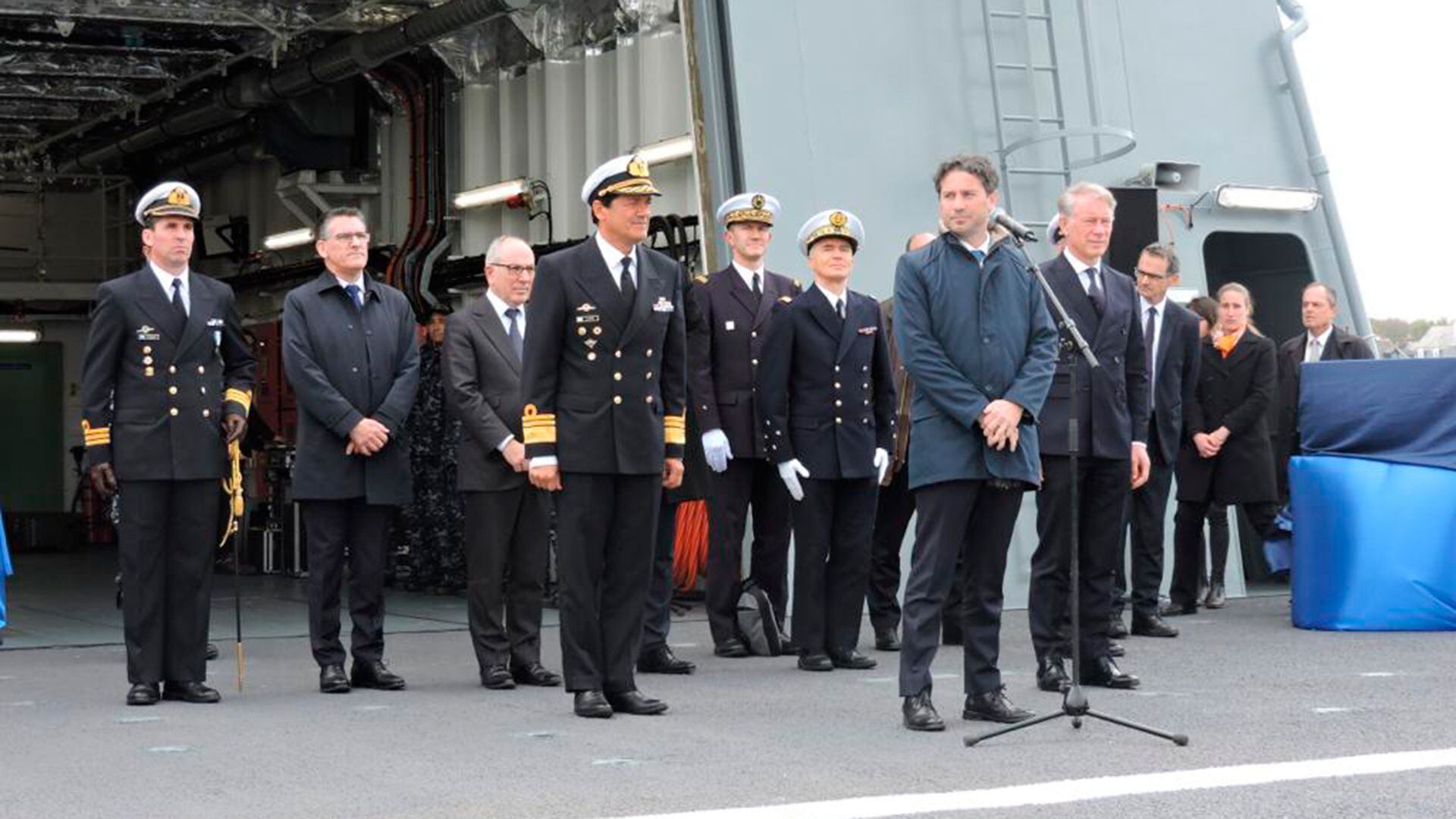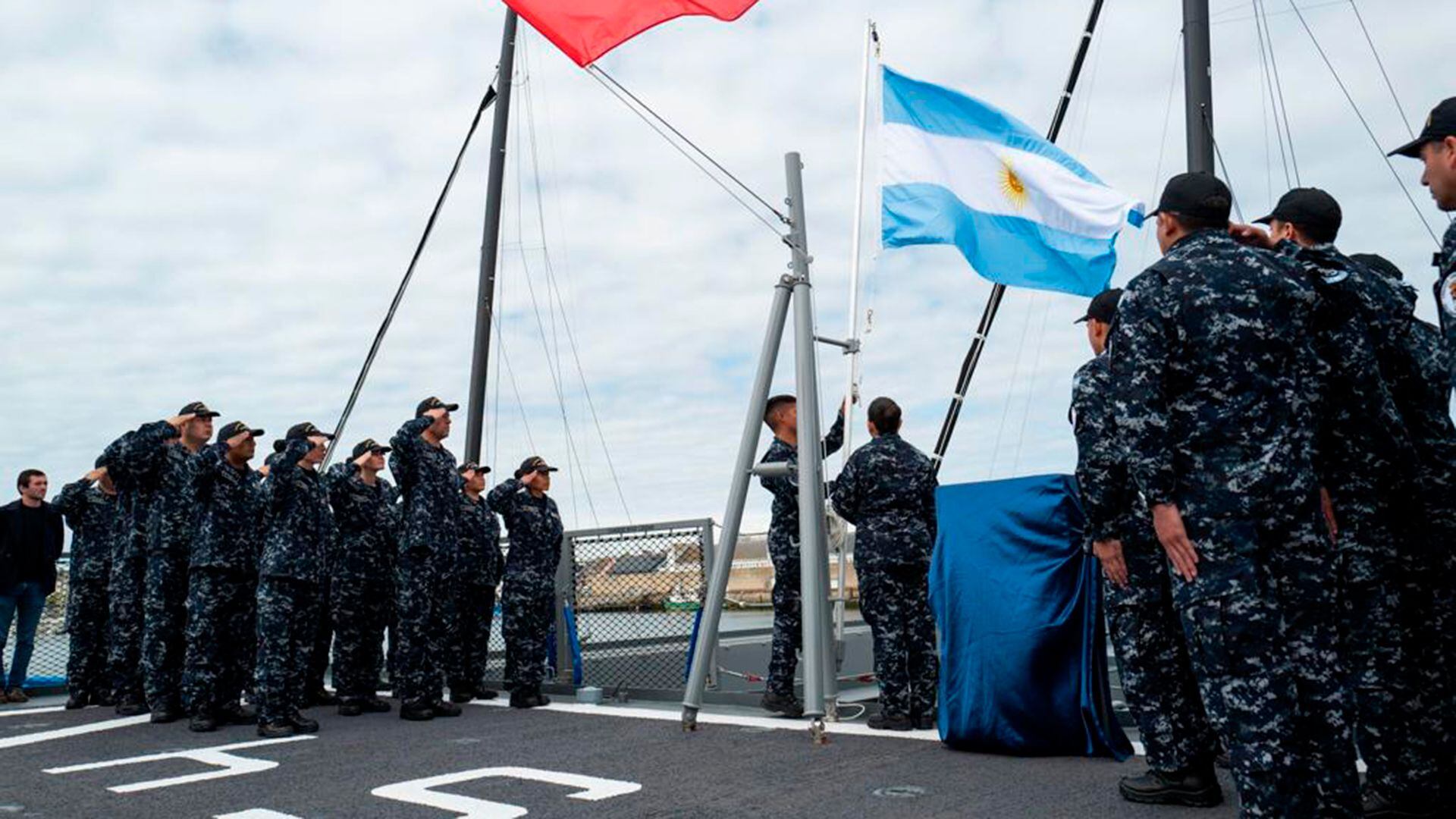 El acto de entrega y afirmación de pabellón estuvo encabezado por el secretario de Asuntos Internacionales para la Defensa Francisco Cafiero junto al subjefe del Estado Mayor General de la Armada Vicealmirante Eduardo Traina y autoridades militares y diplomáticas acreditadas en Francia.