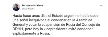 “Hasta hace unos días el Estado argentino había dado una señal inequívoca al condenar en la Asamblea General y votar la suspensión de Rusia del Consejo de DDHH, pero hoy la vicepresidenta evitó condenar explícitamente a Rusia”, señaló.