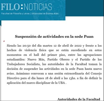 “Siendo las 20:50 del día martes 12 de abril de 2022 y frente a los hechos de violencia física que se están sucediendo en estos momentos en el hall del primer piso, entre las agrupaciones estudiantiles Nuevo Más, Partido Obrero y el Partido de los Trabajadores Socialista, las autoridades de la Facultad toman la decisión de suspender las actividades en la sede Puan hasta nuevo aviso”, informó la institución a través de un comunicado.