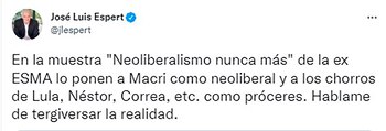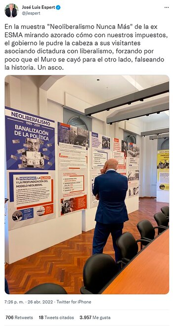 Quizás el más efusivo fue Espert, quien publicó varias fotos y videos con fuertes críticas hacia el kirchnerismo: “En la muestra “Neoliberalismo Nunca Más” de la ex ESMA mirando azorado cómo con nuestros impuestos, el gobierno le pudre la cabeza a sus visitantes asociando dictadura con liberalismo, forzando por poco que el Muro se cayó para el otro lado, falseando la historia. Un asco”, reza uno de los textos.