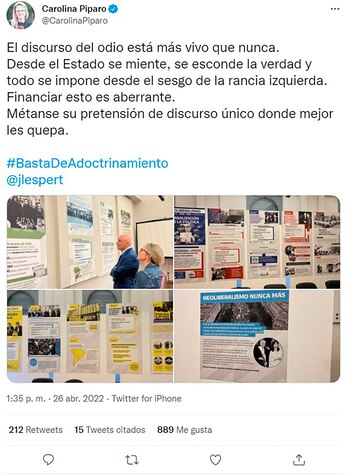 Carolina Píparo también subió un mensaje en contra de la muestra: “El discurso del odio está más vivo que nunca. Desde el Estado se miente, se esconde la verdad y todo se impone desde el sesgo de la rancia izquierda. Financiar esto es aberrante. Métanse su pretensión de discurso único donde mejor les quepa”.