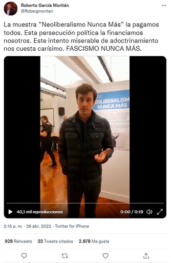 Roberto García Moritán, legislador porteño, fue otro de los que subió un video: “Esto es propaganda política con la tuya, con tus impuestos. Esto es lo que no tiene que hacer un Gobierno”, se lo escucha decir y luego se muestra un breve paneo de los carteles. “La muestra “Neoliberalismo Nunca Más” la pagamos todos. Esta persecución política la financiamos nosotros. Este intento miserable de adoctrinamiento nos cuesta carísimo. FASCISMO NUNCA MÁS”, escribió.