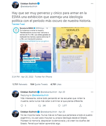 “Hay que ser muy perverso y cínico para armar en la ESMA una exhibición que asemeja una ideología política con el período más oscuro de nuestra historia. Más interesante, sobre todo pensando en las escuelas que visitan la muestra, sería nunca más odiar o eliminar al que piensa diferente. No les importa nada. Nunca más es la frase que pertenece a todo el pueblo argentino y la usan para impulsar su propia ideología desde el Estado. Pisotean la memoria, desprecian la democracia y se creen los dueños del Estado. Pensé que habían aprendido algo”, manifestó.