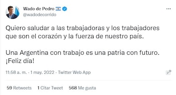 El ministro del Interior, Eduardo “Wado” De Pedro, saludó a los trabajadores que “son el corazón y la fuerza de nuestro país. Una Argentina con trabajo es una patria con futuro. ¡Feliz día!”.