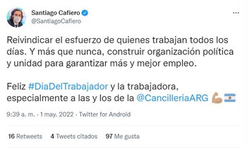 “Reivindicar el esfuerzo de quienes trabajan todos los días. Y más que nunca, construir organización política y unidad para garantizar más y mejor empleo. Feliz Día del Trabajador y la Trabajadora, especialmente a las y los de la Cancillería”, posteó el ministro de Relaciones Exteriores, Santiago Cafiero.