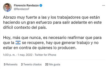 A su vez, el diputado nacional por la provincia de Buenos Aires Florencio Randazzo, escribió: “Abrazo muy fuerte a las y los trabajadores que están haciendo un gran esfuerzo para salir adelante en este difícil contexto del país. Hoy, más que nunca, es necesario reafirmar que para que la Argentina se recupere, hay que generar trabajo y no estar en contra de quienes lo producen”.