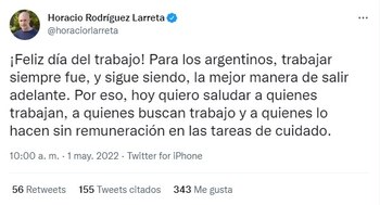 En tanto, el jefe de Gobierno porteño, Horacio Rodríguez Larreta, expresó: “¡Feliz día del trabajo! Para los argentinos, trabajar siempre fue, y sigue siendo, la mejor manera de salir adelante. Por eso, hoy quiero saludar a quienes trabajan, a quienes buscan trabajo y a quienes lo hacen sin remuneración en las tareas de cuidado”.