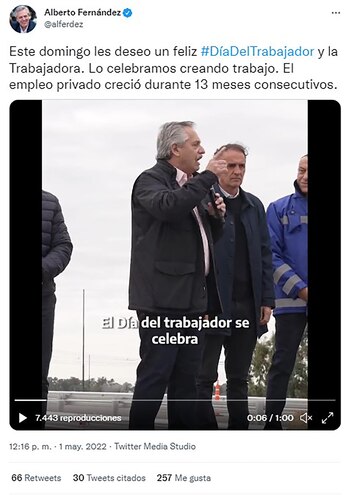 El presidente Alberto Fernández publicó esta mañana un mensaje por el Día del Trabajador en sus redes sociales en el que aseguró que “el empleo privado creció durante 13 meses consecutivos” y prometió que “cada funcionario del Gobierno va a ser el ministro del salario, para que el salario de una vez por todas se recomponga en la Argentina”.