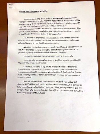 “Las provincias argentinas observamos con suma preocupación el inminente fallo del máximo tribunal en virtud del vencimiento del plazo establecido para la conciliación entre las partes. No existe razón alguna para pretender modificar la transferencia de recursos alterando el plexo normativo constitucional precisamente de parte de aquellos que deberían ser sus celosos custodios”, agregaron las provincias firmantes.