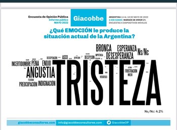 “Le pedimos a los encuestados que nos digan con una sola palabra qué emoción los domina hoy y espontáneamente aparece la tristeza, la angustia y un sinfín de palabras que hablan de una depresión colectiva”, precisó a Infobae el analista político Jorge Giacobbe, que dirige la consultora.