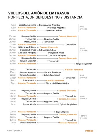 La Unidad de Datos de Infobae reconstruyó los vuelos que realizó esta aeronave desde que fue adquirida por el gobierno de Nicolás Maduro en febrero de 2022, a partir de los registros históricos en la base de datos Flight Radar. Fueron 32 tramos aéreos desde esa fecha, todos bajo la lógica de alianzas políticas del chavismo. Sin embargo, se desconoce hasta ahora quiénes fueron sus tripulantes en esos vuelos y qué tipo de carga se trasladó.