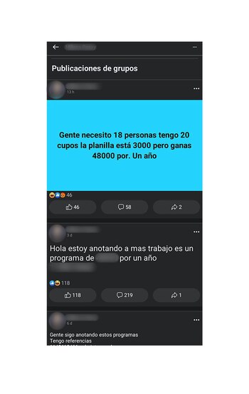 En los grupos de Facebook, los beneficiarios de los programas Potenciar Trabajo y personas interesadas en la asistencia del Estado crearon comunidades en las que piden información sobre los planes sociales y preguntan por los fechas de cobro, entre otras dudas comunes. Sin embargo, lo más curioso de estos grupos es que revelan los abusos e irregularidades que se cometen en nombre de la política social. Entre estas prácticas, emerge un auténtico “mercado” virtual de gestores, que ofrecen servicios variopintos: desde el cobro de “altas” o recuperación de pagos en los planes sociales, la adhesión a obras sociales, el “alquiler” de cuentas de Mercado Pago o hasta el reclutamiento de personas para las cooperativas.