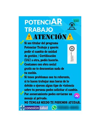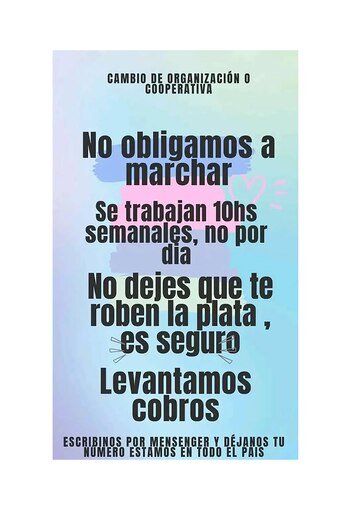 “Somos una organización seria animate pasate con nosotros, acá nadie te obliga a trabajar, y también levantamos planes que se dieron de baja. No discriminamos a nadie”, remarca uno de los mensajes. “Cambiate a nuestra organización”, dice otra presunta agrupación. “Si tenes un problema con tu referente, si te hacen trabajar más horas de lo debido o ejercen algún tipo de violencia sobre tu persona, podés solicitar el cambio. Por asesoramiento podés enviarme un mensaje al privado. No tengas miedo te podemos ayudar”, publican desde “Amparos reclamos”, una cuenta que busca aparentar asesoramiento.