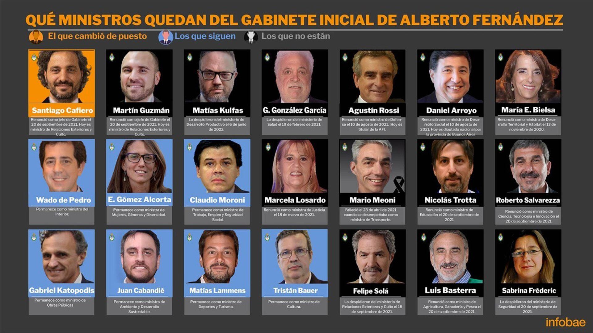 20:06: Menos de la mitad de los ministros del gabinete inicial de Alberto Fernández permanecen en sus cargos. La renuncia de Martín Guzmán representó un nuevo resquebrajamiento en la estructura del Gobierno nacional. Apenas 8 de los 21 funcionarios presentados en diciembre de 2019 siguen en sus mismos puestos.