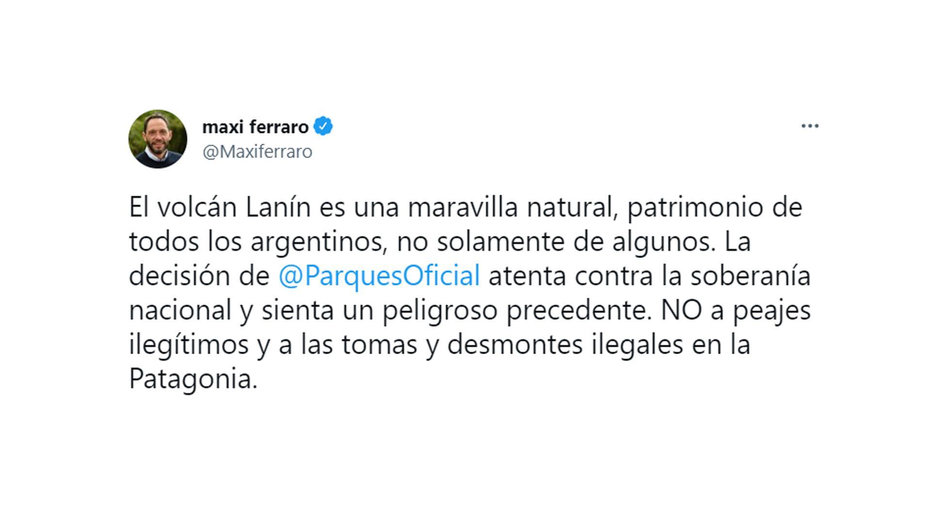 En la misma línea se expresó el diputado nacional Maximiliano Ferraro. “El volcán Lanín es una maravilla natural, patrimonio de todos los argentinos, no solamente de algunos. La decisión de Parques Nacionales atenta contra la soberanía nacional y sienta un peligroso precedente. NO a peajes ilegítimos y a las tomas y desmontes ilegales en la Patagonia“, publicó el presidente de la Coalición Cívica ARI en la red social del pajarito.