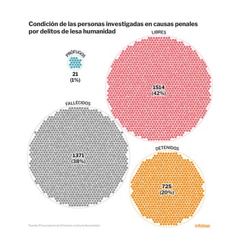 La Unidad de Datos de Infobae accedió al último reporte de la Procuraduría de Crímenes contra la Humanidad, publicado el 15 de septiembre pasado. También se consultó el Monitor de Juicios de Lesa Humanidad, una herramienta digital que permite acceder a estadísticas de los juicios orales, así como al análisis de la velocidad de los debates.