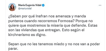 Por su parte, el diputado cordobés de la Unión Cívica Radical, Mario Negri, dijo: “Mi solidaridad con @mariuvidal, que en Formosa recibió ataques de la patota del PJ y agravios del gobernador preferido de Cristina y Alberto. Insfrán hace décadas que confunde Estado y Gobierno con él mismo. Atrasa un siglo”.