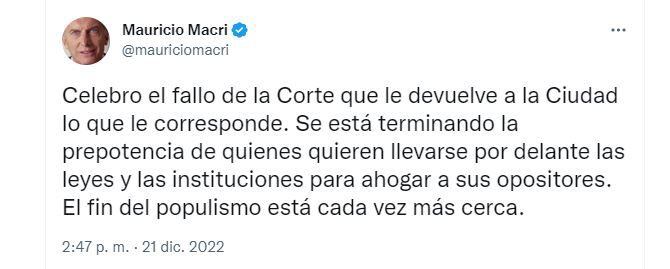 “Celebro el fallo de la Corte que le devuelve a la Ciudad lo que le corresponde”, apuntó Macri en el inicio de su mensaje publicado también a través de Twitter. A continuación, agregó: “Se está terminando la prepotencia de quienes quieren llevarse por delante las leyes y las instituciones para ahogar a sus opositores”.