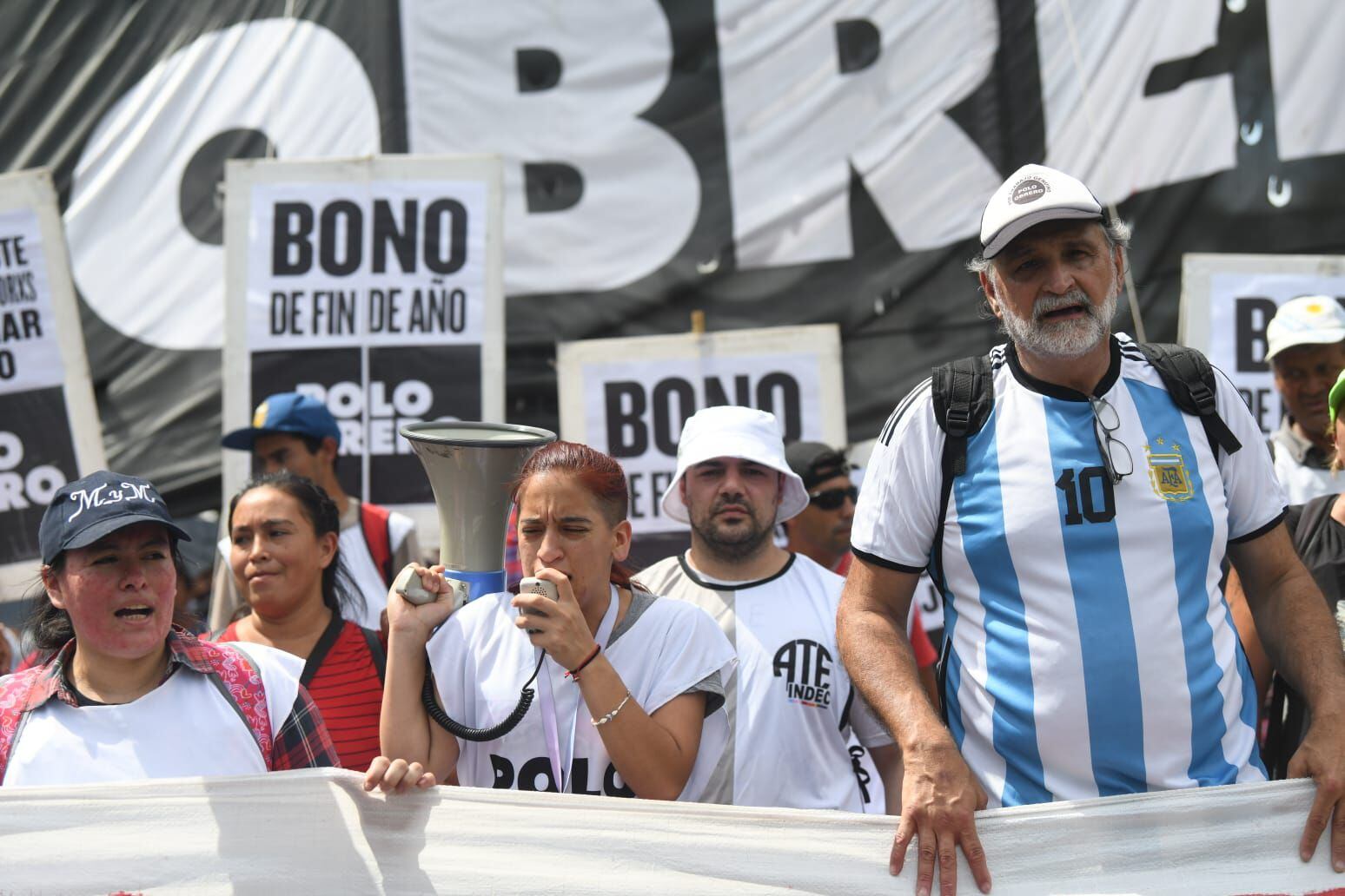 El reclamo inició esta tarde a las 13, cuando las columnas concentraron a los pies del Obelisco. A propósito de lo que se demanda, señalaron: “No aceptamos las bajas masivas que afectan a decenas de miles de compañeros que sobreviven con el programa Potenciar Trabajo, la falta de alimentos en los comedores populares y la burla de un bono miserable que pone de manifiesto que el ajuste del FMI golpea brutalmente a los que menos tienen”. El beneficio al que apuntan es que fue anunciado de manera oficial una semana atrás: de 13.500 pesos, en dos tramos.