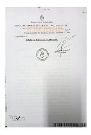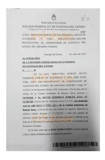 La denuncia recayó en el juzgado federal del santiagueño Guillermo Molinari, quien imputó a Robles y ordenó que “con carácter de urgencia deposite su teléfono celular” en la secretaria de turno correspondiente, ya que hay feria judicial. Para esto, el magistrado federal envió un oficio a través de la Policía Federal para anoticiar a Robles de la medida. La resolución del juez alcanza al celular que usa habitualmente Robles y a “todo aparato de telefonía celular que tenga en uso habitual, personal u oficial.