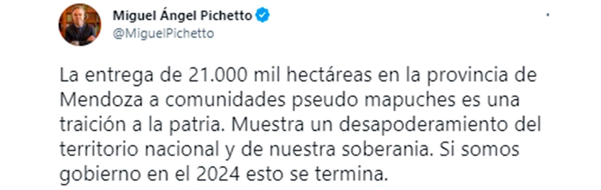 Del mismo modo se expresó Miguel Ángel Pichetto, actual miembro de la Auditoria General de la Nación. “La entrega de 21.000 mil hectáreas en la provincia de Mendoza a comunidades pseudo mapuches es una traición a la patria. Muestra un desapoderamiento del territorio nacional y de nuestra soberania. Si somos gobierno en el 2024 esto se termina”, dice el tuit publicado el lunes pasado, día en el que se conoció la cuestionada disposición del Estado.