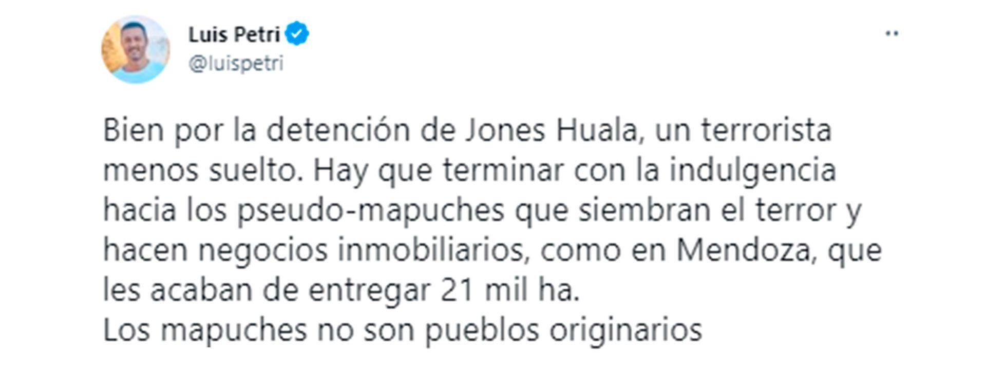 Luis Petri, ex diputado nacional por la provincia de Mendoza, también celebró la detención de Jones Huala pero, al mismo tiempo, consideró que “los mapuches no son pueblos originarios” cuando se anunció la cesión de tierras a la comunidad mapuche en Mendoza.