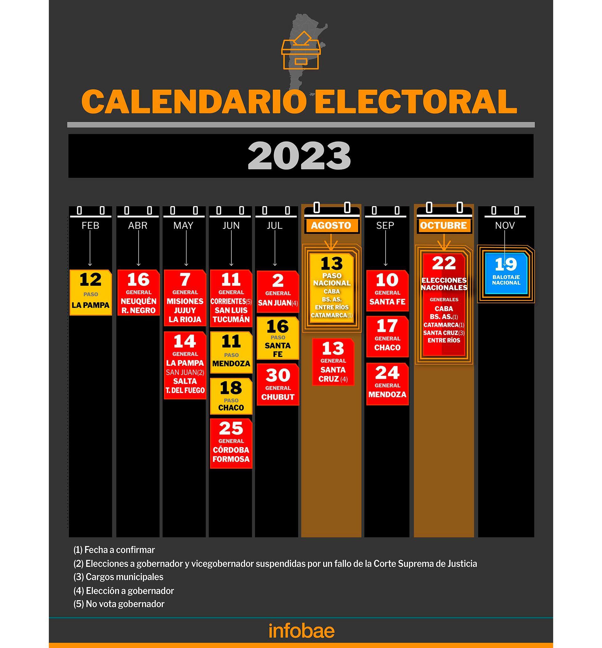 El calendario electoral 2023 en Argentina tiene muchos puntos clave. Esto se debe a que el 13 de agosto (PASO) y el 22 de octubre (elecciones nacionales generales) tendrán lugar los comicios para elegir presidente, vicepresidente, diputados y senadores para el Congreso de la Nación, pero también a lo largo del año habrá elecciones provinciales para definir cada Poder Ejecutivo local, con excepción de Santiago del Estero y Corrientes que no votan gobernador este año.