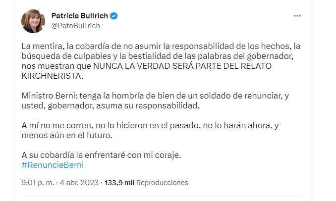 Tras los dichos de Kicillof, Patricia Bullrich respondió a través de su cuenta oficial en Twitter. “La mentira, la cobardía de no asumir la responsabilidad de los hechos, la búsqueda de culpables y la bestialidad de las palabras del gobernador, nos muestran que nunca la verdad será parte del relato kirchnerista”, señaló.