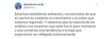 Y completó: “Estamos redoblando esfuerzos, convencidos de que el camino es sostener el crecimiento y el orden que estamos logrando. Y sabemos que la mayoría de los análisis nos muestran que este fue el peor momento y que comenzó una tendencia a la baja que esperamos ver reflejada próximamente”.