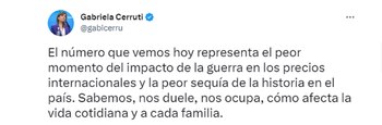 “El número que vemos hoy representa el peor momento del impacto de la guerra en los precios internacionales y la peor sequía de la historia en el país. Sabemos, nos duele, nos ocupa, cómo afecta la vida cotidiana y a cada familia”, comenzó Cerruti.