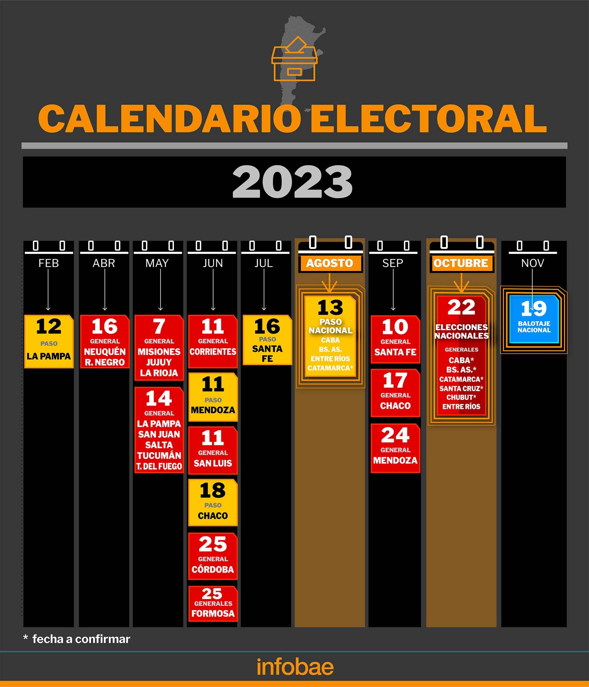 El 10 de septiembre llegarán las definiciones electorales a Santa Fe, una semana después a Chaco y 15 días más tarde a Mendoza. El 22 de octubre, fecha de las elecciones generales para presidente, vice, 130 diputados y 24 senadores nacionales, también será la fecha en que la Ciudad de Buenos Aires defina a su jefe de Gobierno, vice y legisladores locales y, en Entre Ríos, la elección de gobernador, intendentes, senadores y diputados provinciales.