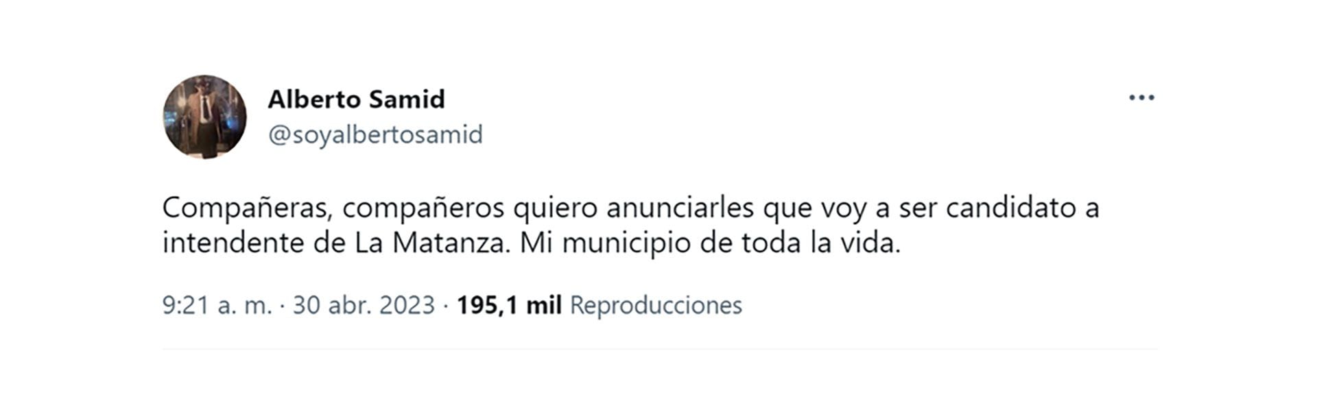 “Compañeras, compañeros quiero anunciarles que voy a ser candidato a intendente de La Matanza. Mi municipio de toda la vida”, escribió Alberto Samid en sus redes sociales durante la mañana de este domingo. De esa forma, confirmó que se meterá de lleno en la pelea por la gobernación de municipio más poblado de la provincia de Buenos Aires.